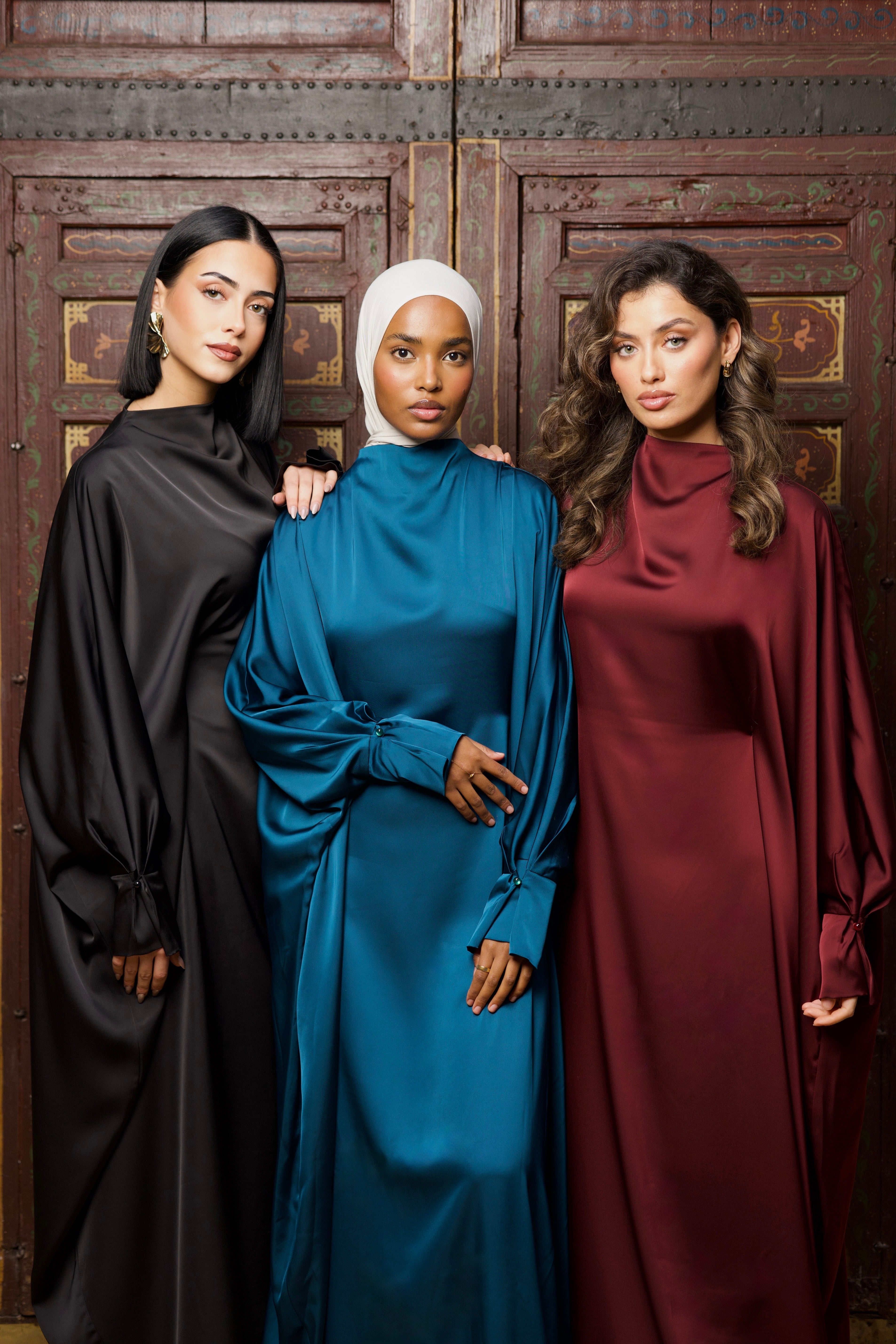 Elegante Butterfly-Abaya aus sanft fließendem Satin mit seidenartigem Finish. Dank innenliegender Bänder individuell anpassbar für jede Figur. Veredelt mit feinen Perlendetails an den Ärmeln und einem hohen Kragen für eine luxuriöse Ausstrahlung. Perfekt zu Ramadan und Eid.