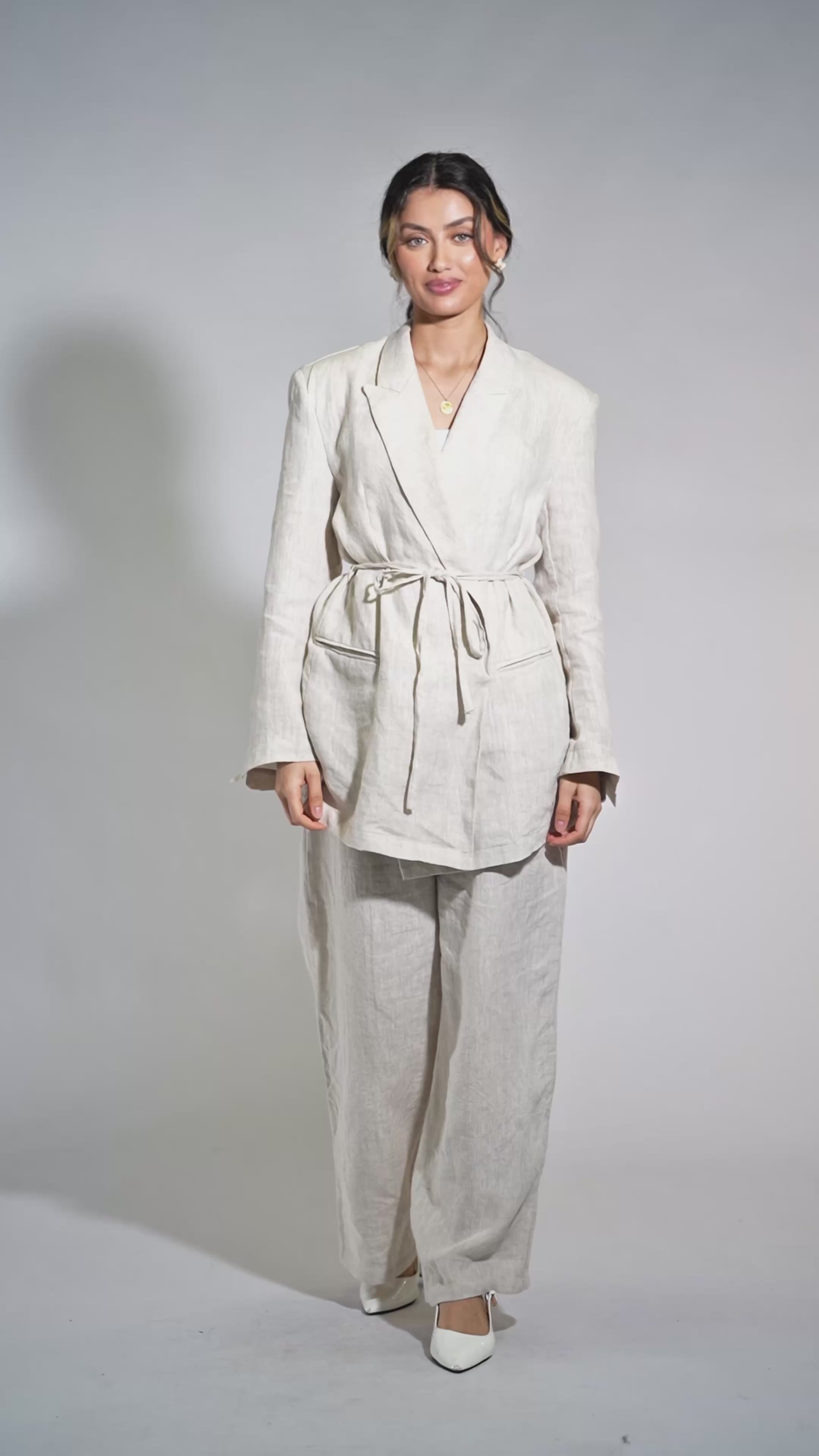 Ein Statement-Piece: Dieser oversize geschnittene Leinen-Blazer vereint noble Lässigkeit mit zeitloser Eleganz. Der feine Bindegürtel betont die Taille dezent und sorgt für eine feminine Silhouette – ein vielseitiger Begleiter für stilvolle Herbst-Looks.