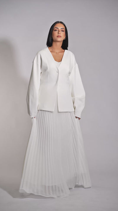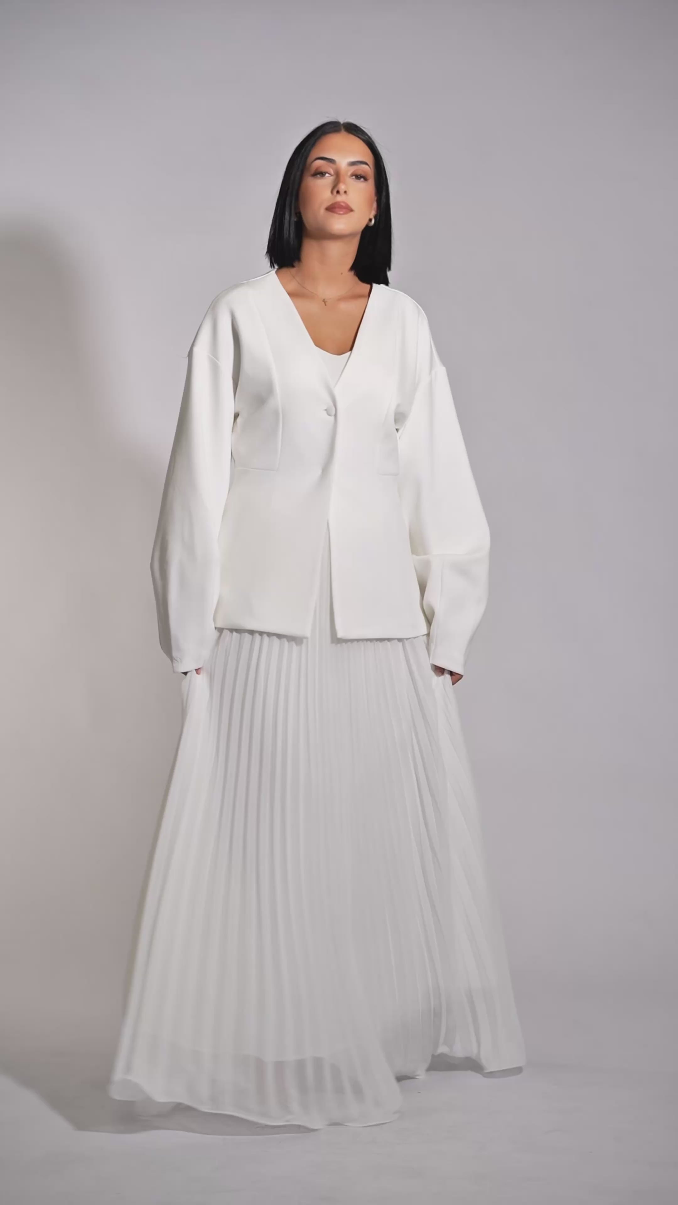 Ein Design, das die kultivierte Zurückhaltung und feine Raffinesse der Wiener Gesellschaft verkörpert. Der Opera Blazer präsentiert sich in edlem Elfenbein, mit einer sanft taillierten, doppelt geknöpften Front, die an die Präzision traditioneller Maßschneiderei erinnert.