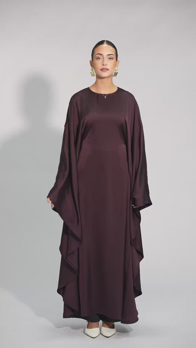 Elegante Butterfly-Abaya aus seidenweichem Satin mit luxuriösem Fall. Dank innenliegender Bänder individuell anpassbar für jede Figur. Der hohe Kragen verleiht der Abaya eine edle, königliche Ausstrahlung. Ideal für Ramadan und Eid.