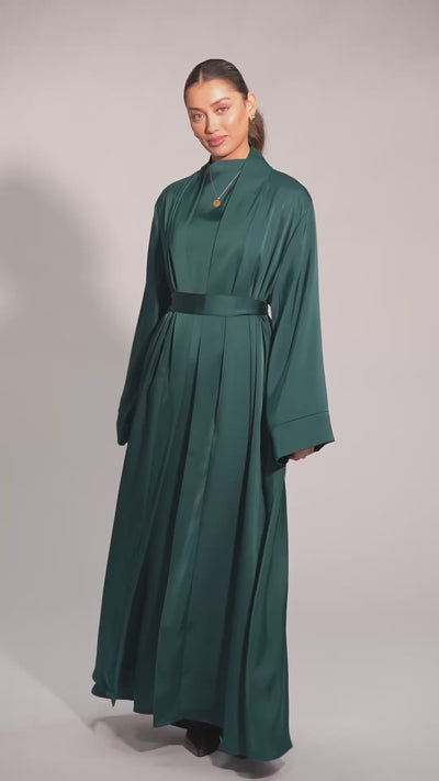 Exklusive Kimono-Abaya aus sanft fließendem Satin mit seidenartigem Glanz. Bestehend aus einem langärmligen Unterkleid, Kimono und passendem Gürtel, ermöglicht sie vielseitige und elegante Tragevariationen. Der hohe Kragen unterstreicht die edle Silhouette und verleiht dem Design eine luxuriöse Ausstrahlung.