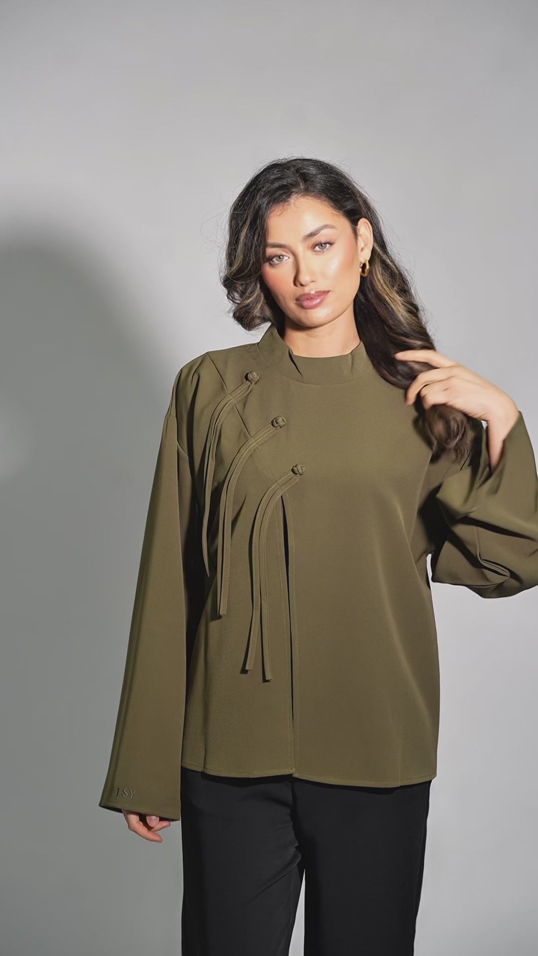 Das Legacy Shirt ist aus edlen Materialien gefertigt und verfügt über ein eingearbeitetes Untertop, das für perfekte Blickdichte sorgt. Zarte Details im Brustbereich setzen elegante Akzente, während die weit geschnittenen Ärmel dem Design eine sanfte, fließende Bewegung verleihen.
