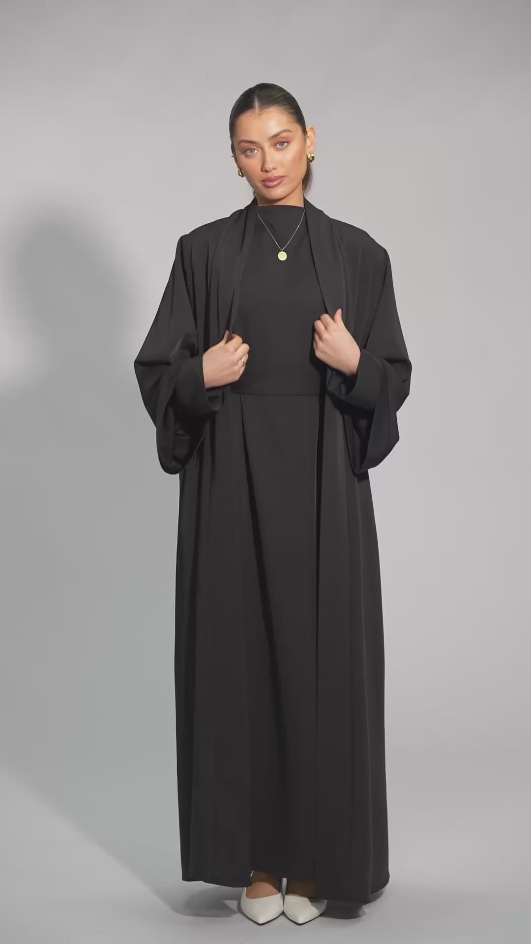 An elegant kimono-style abaya made from soft, flowing viscose with a comfortable, lightweight feel. Consisting of a long-sleeved underdress, kimono, and matching belt, it offers versatile styling and wearing options. The high collar adds a touch of sophistication to the silhouette and combines comfort with timeless elegance.