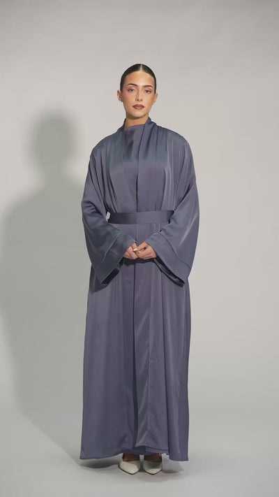An exclusive kimono-abaya made of softly flowing satin with a silky sheen. Consisting of a long-sleeved underdress, kimono, and matching belt, it offers versatile and elegant styling options. The high collar accentuates the refined silhouette and lends the design a luxurious feel.