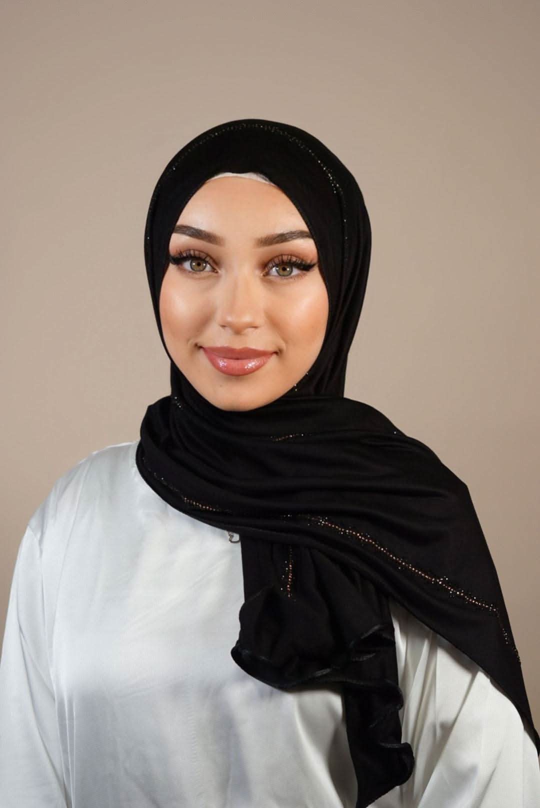 Unique et spécial - nous présentons fièrement notre collection rayonnante de hijabs, fabriqués à partir du meilleur tissu en jersey et décorés de détails en strass étincelants. Ces foulards se caractérisent par une qualité inégalée et sont garantis d'être un véritable accroche-regard ! Le tissu jersey se caractérise par sa texture exceptionnelle, il est antidérapant et opaque. Porter les foulards sans os est également une option. Grâce à son drapé parfait, vous n'avez besoin que de peu de temps pour votre style hijab quotidien. Nos hijabs Jersey Line uniques et particulièrement haut de gamme avec des ornements en strass sont un incontournable pour toute garde-robe qui exige élégance et glamour.