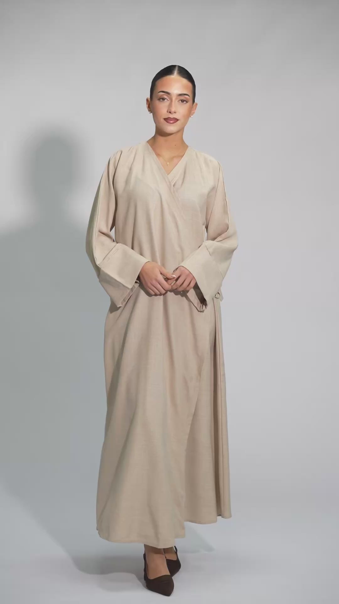 Die Wickel Linen Abaya vereint natürliche Leichtigkeit mit femininer Eleganz. Durch den Wickelschnitt lässt sie sich individuell anpassen und fällt besonders fließend. Inklusive passendem Hijab – ein stilvolles Ensemble für elegante Ramadan- und Eid-Momente.