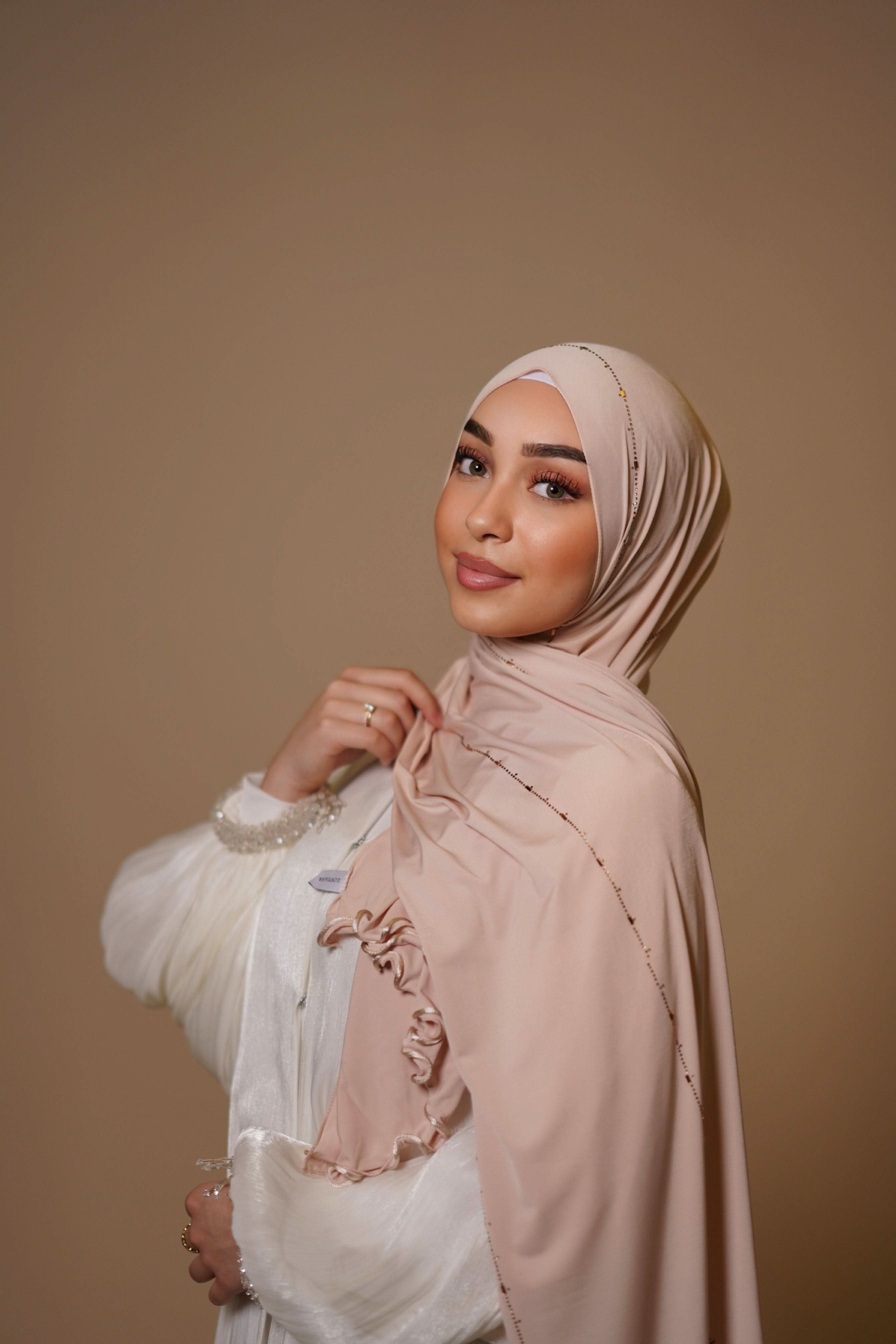 Unique et spécial - Fabriqué à Dubaï, nous présentons fièrement notre collection radieuse de hijabs, confectionnés à partir du meilleur tissu jersey haut de gamme et agrémentés de détails en strass étincelants. Ces foulards se caractérisent par une qualité inégalée et sont garantis d'être un véritable accroche-regard ! Le tissu jersey haut de gamme se caractérise par sa texture exceptionnelle, il est antidérapant et opaque. Porter les foulards sans os est également une option. Grâce à son drapé parfait, vous n'avez besoin que de peu de temps pour votre style hijab quotidien. Nos hijabs Premium Jersey Line uniques et particulièrement haut de gamme avec des ornements en strass sont un incontournable pour toute garde-robe qui exige élégance et glamour.